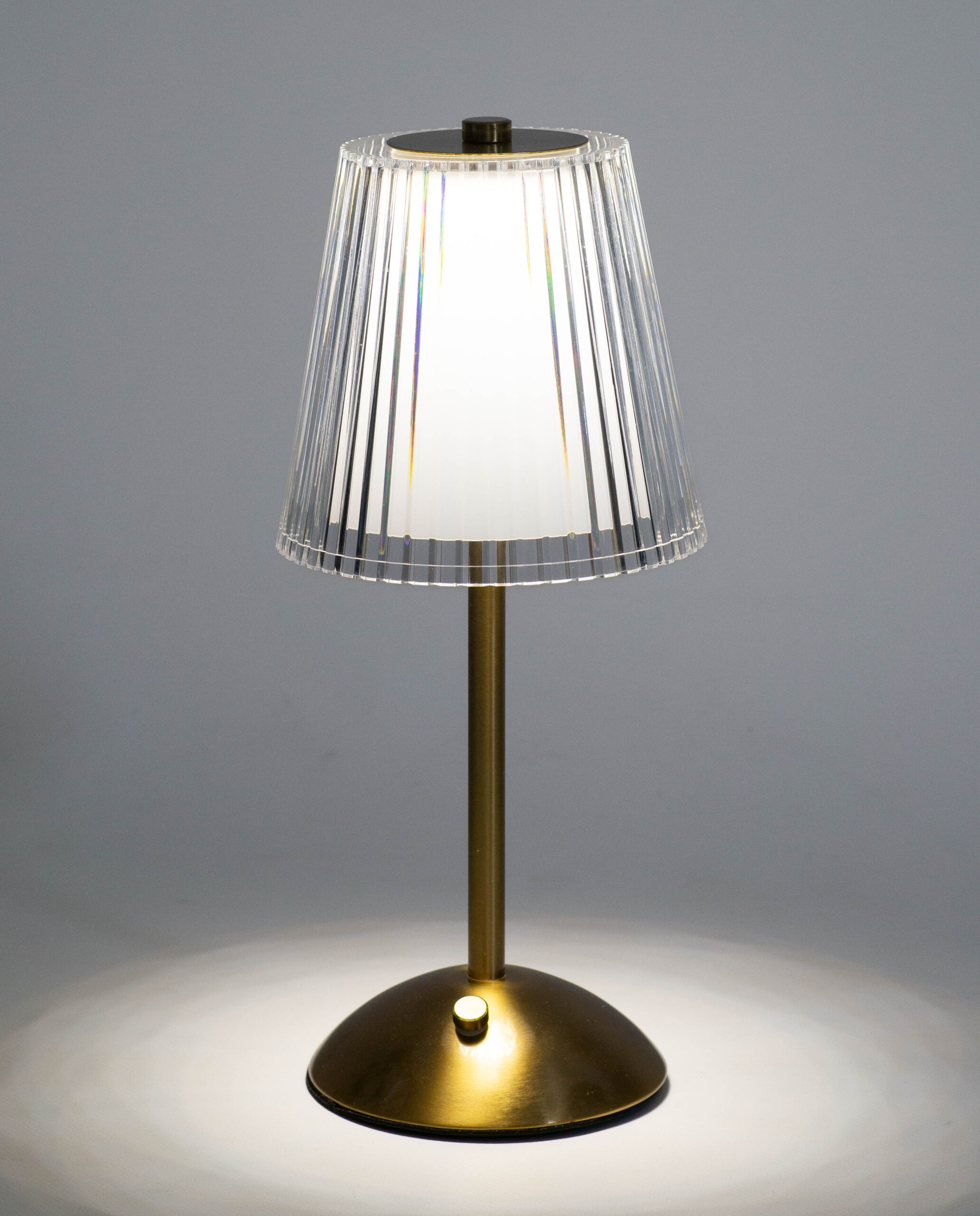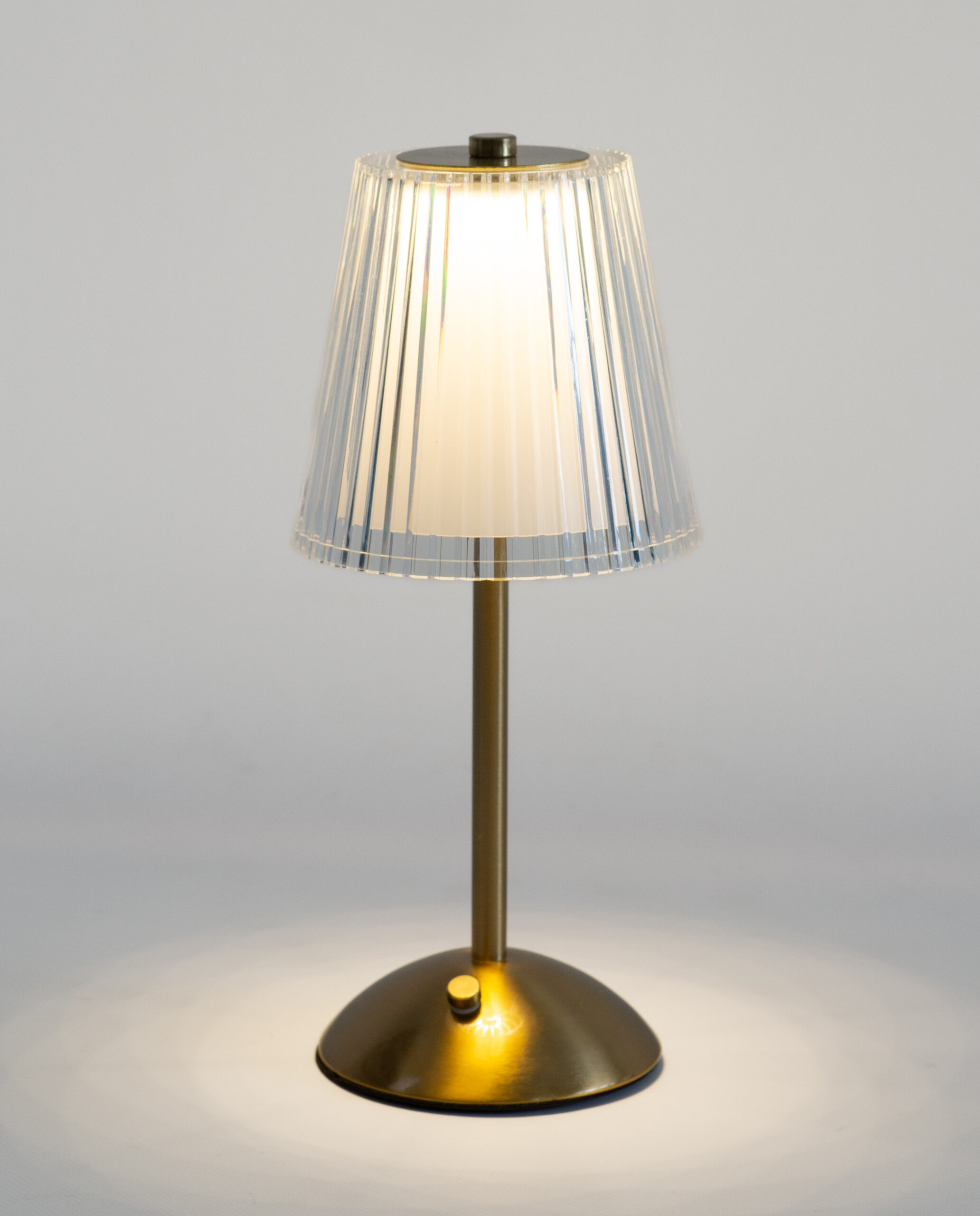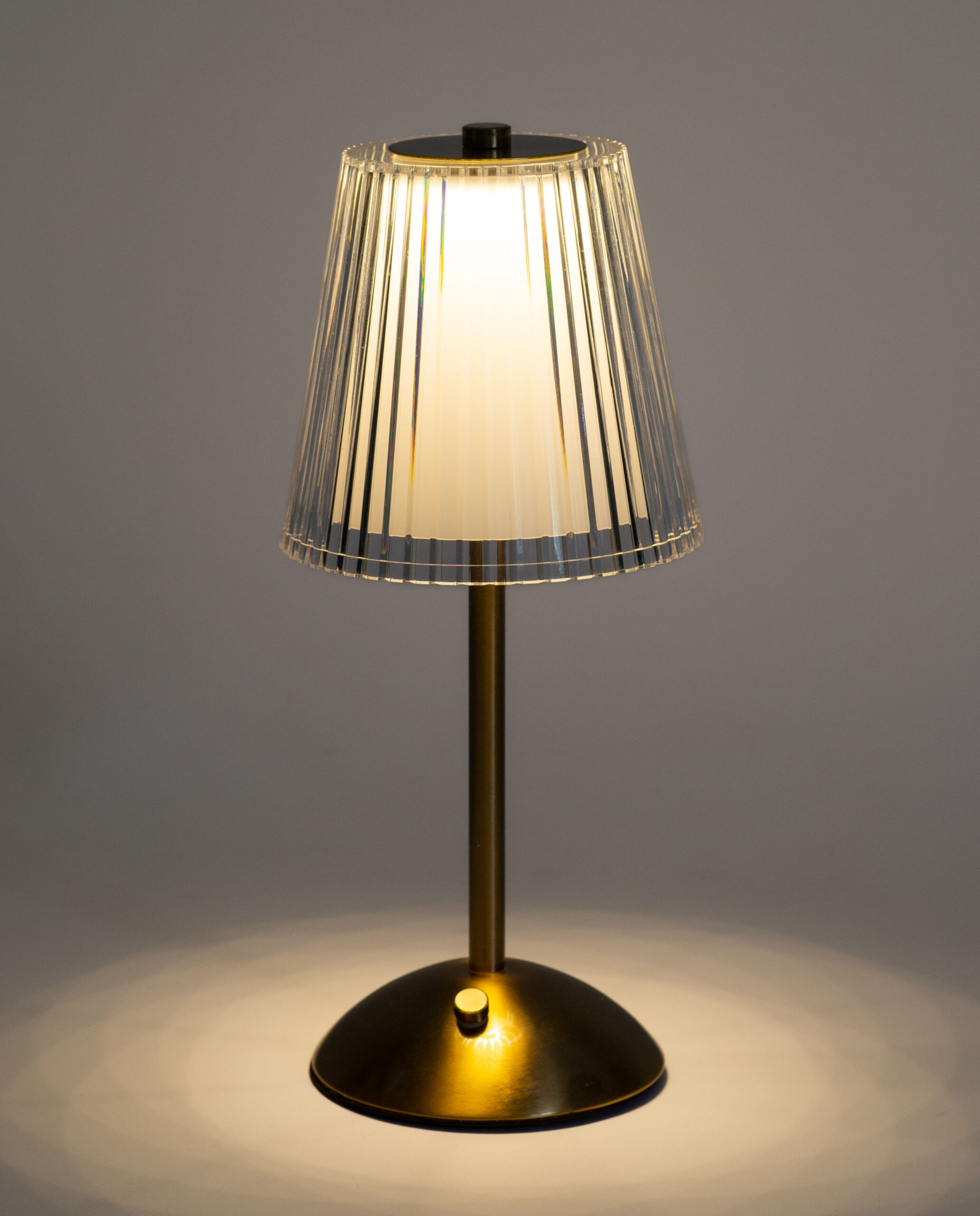 Akku-Tischleuchter in messing + klaren konischen Schirm