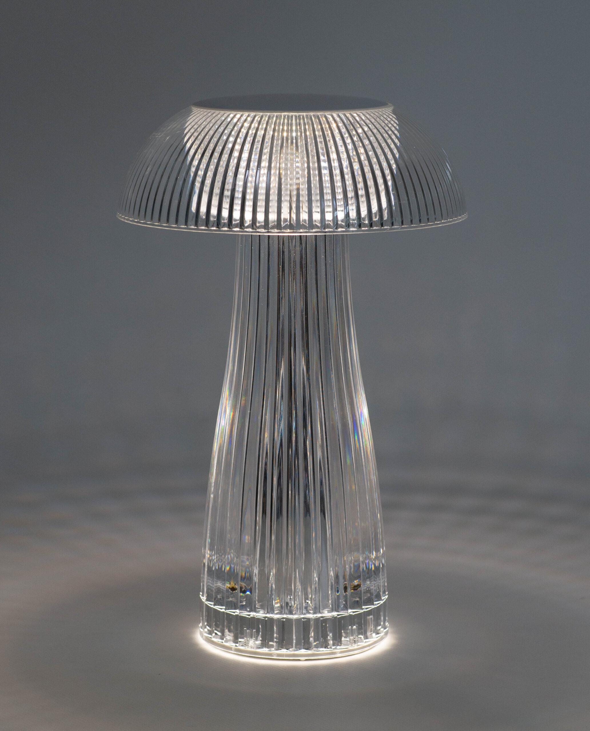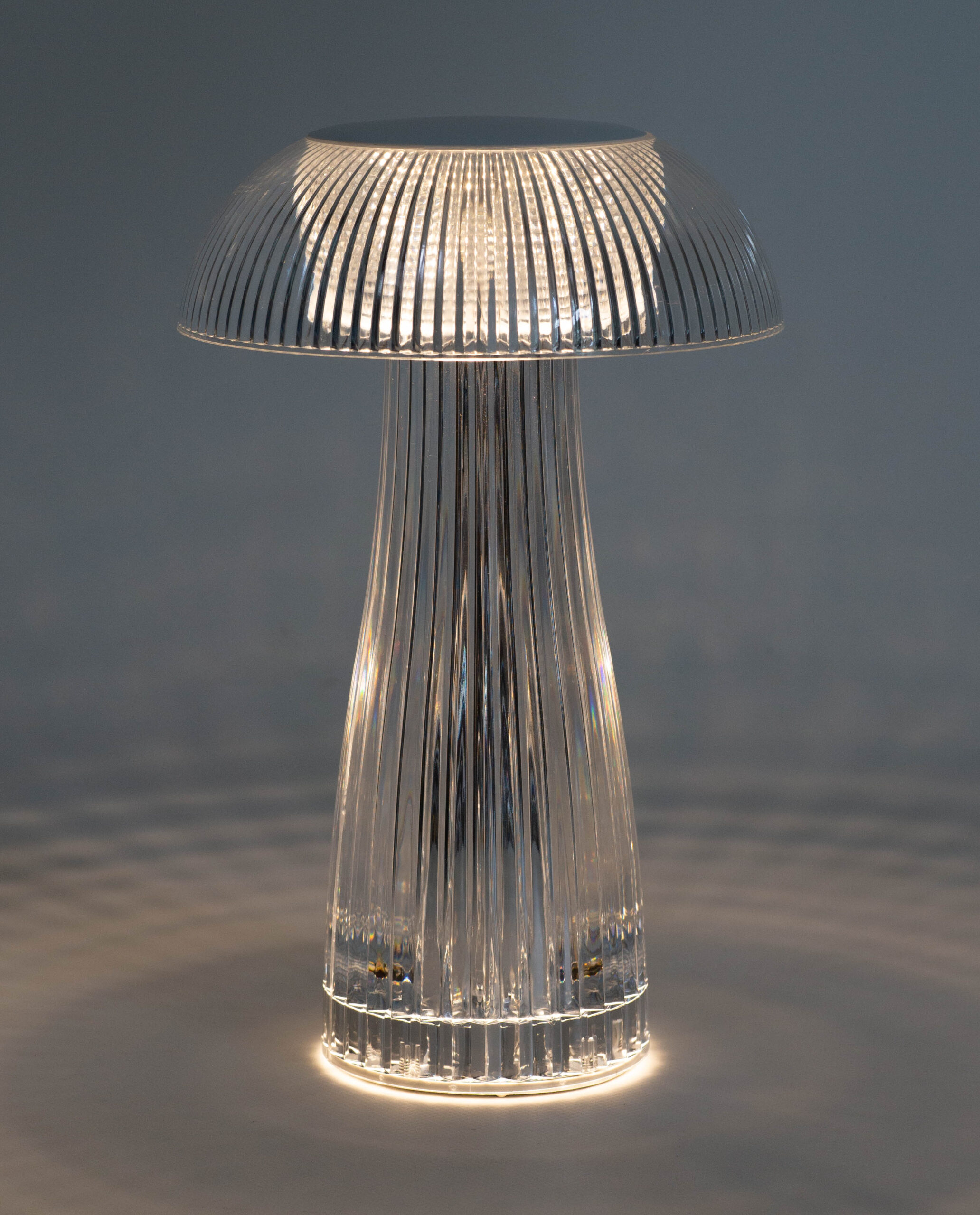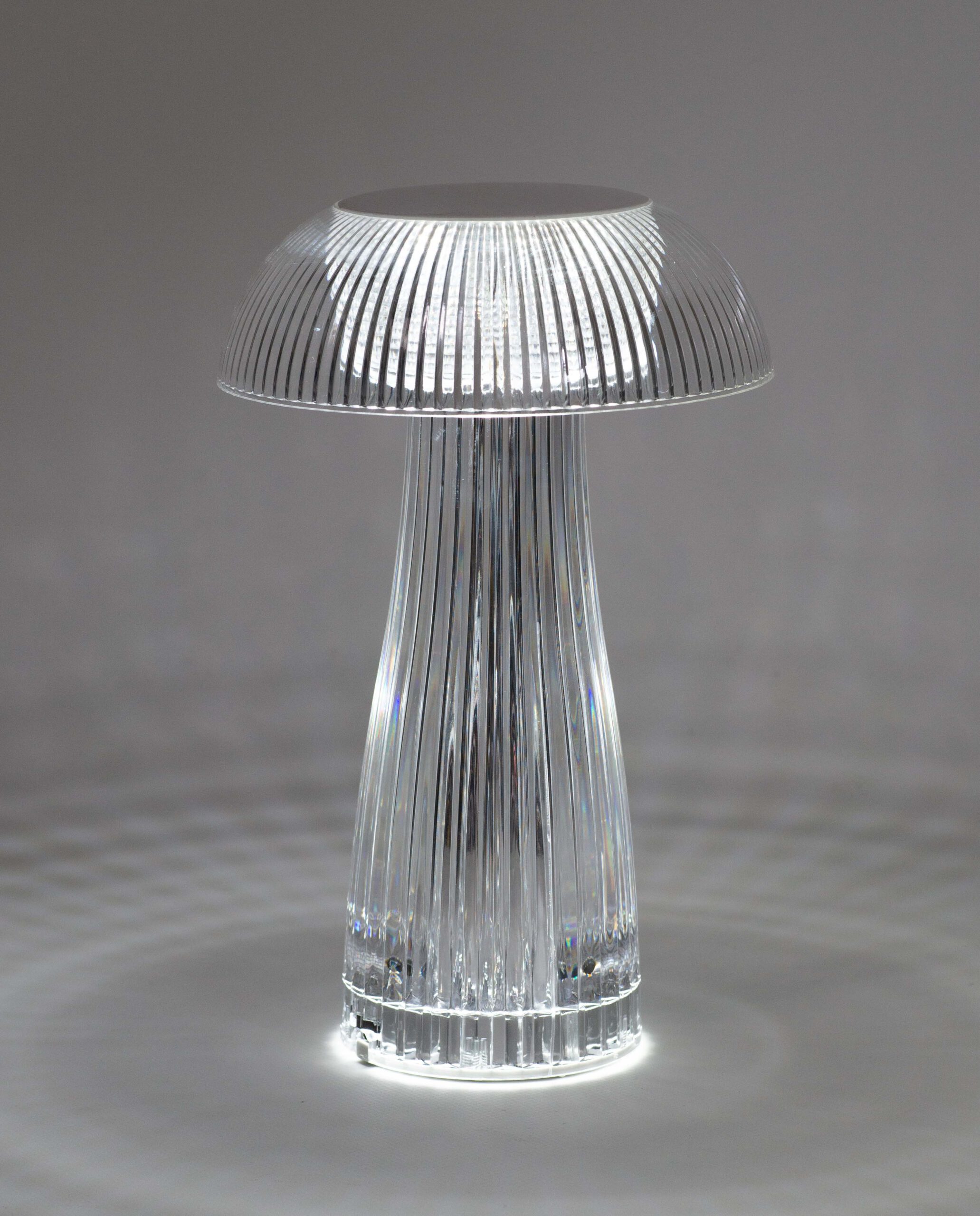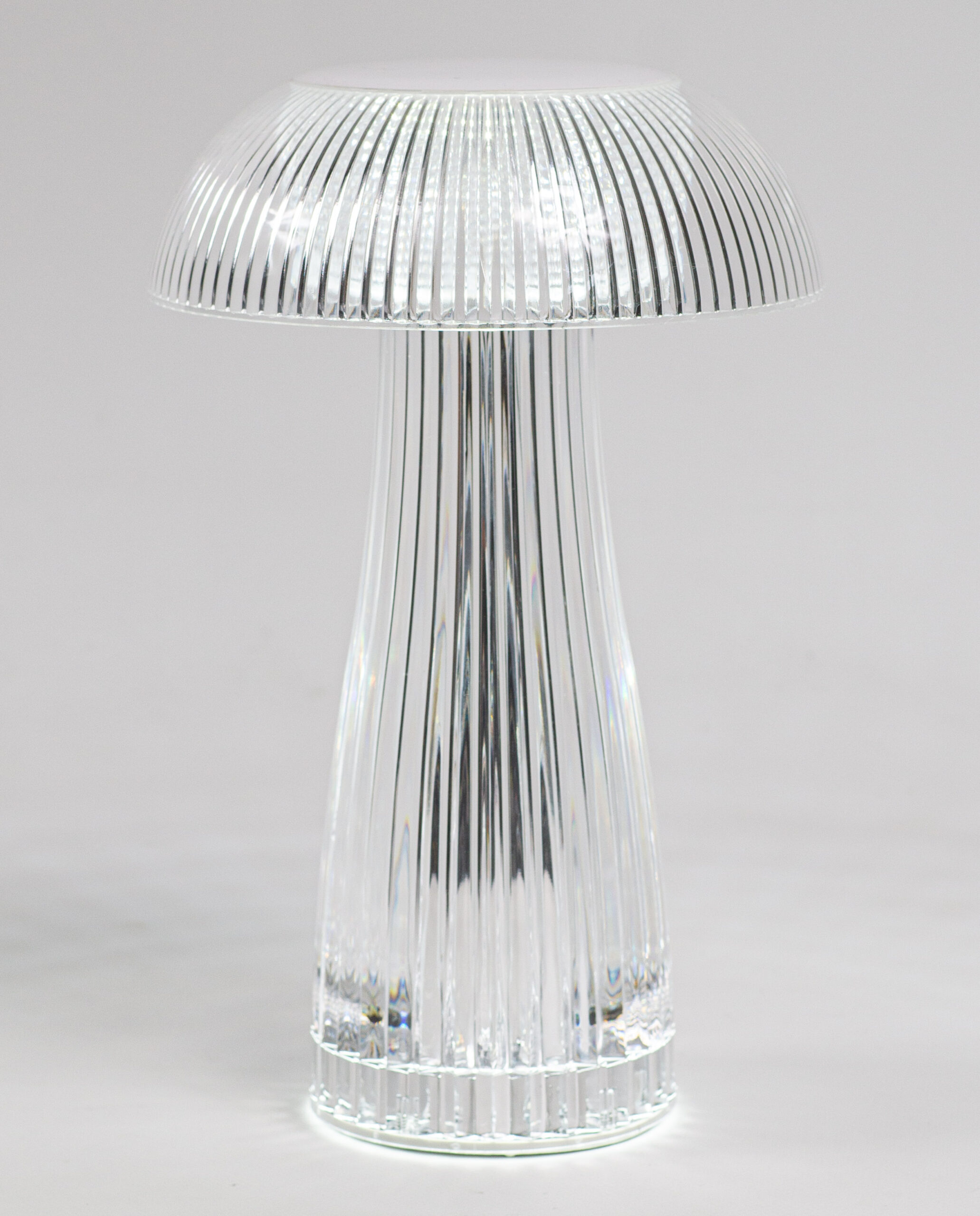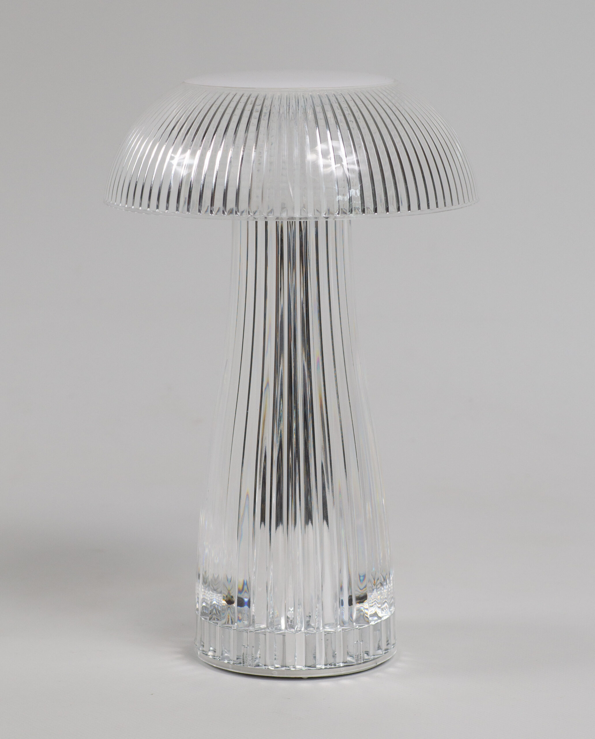 pilzförmiger Akku-Tischleuchter aus transparenten Kunststoff