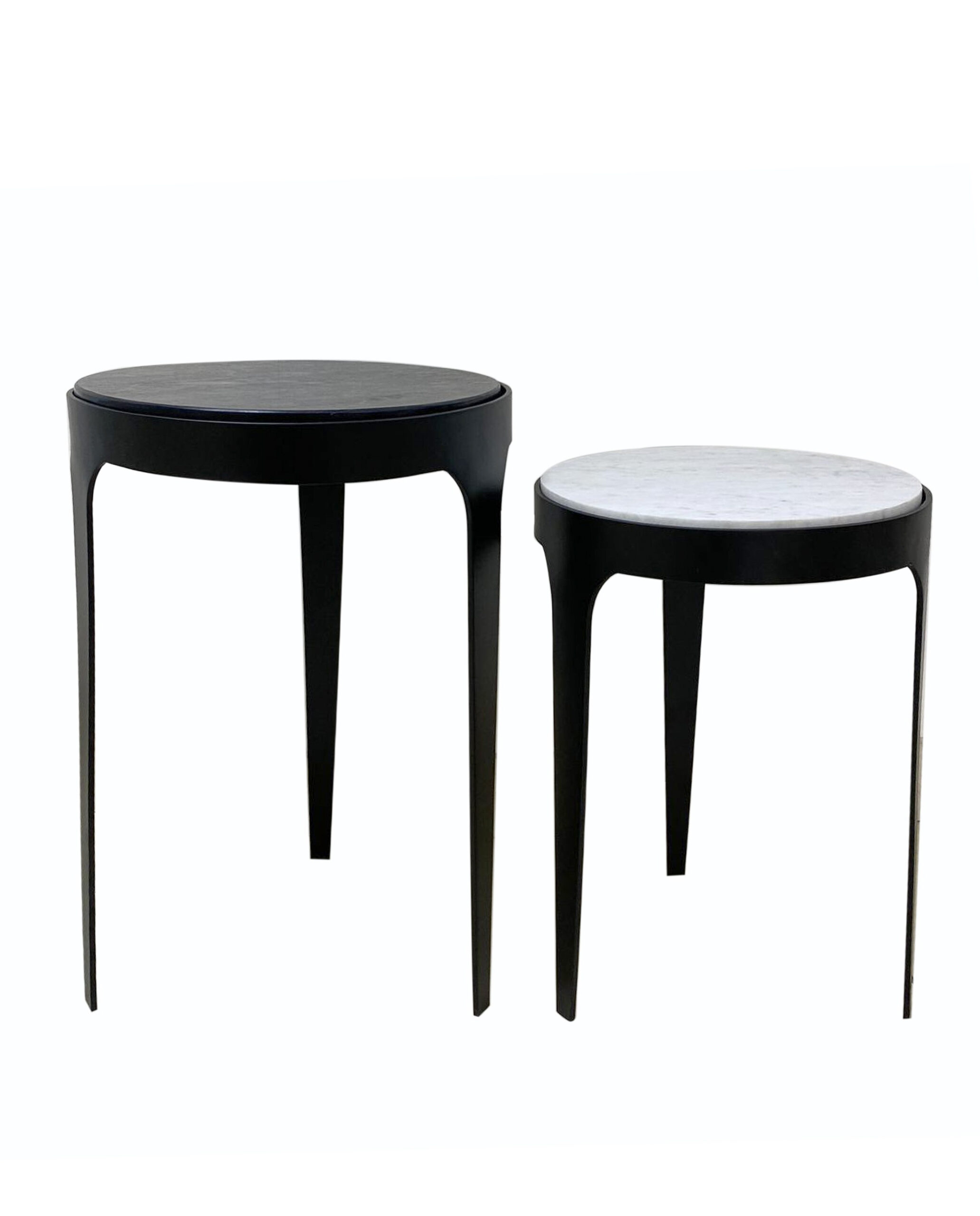 Set aus 2 Metall-Beistelltischen in schwarz, Steinplatte in schwarz + weiß