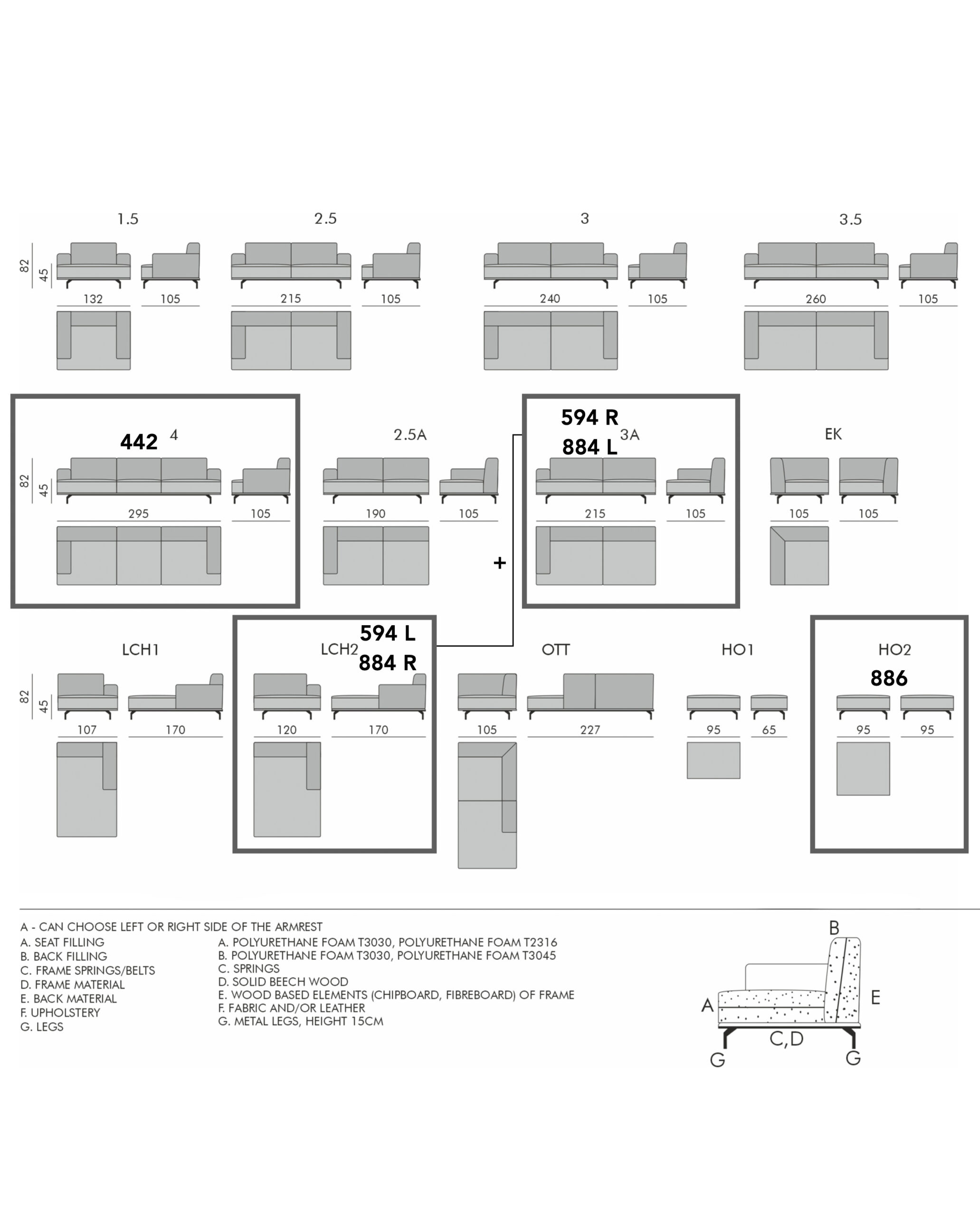 | Modell | Hocker, Sofa B 295, Sofa mit Longchair links, Sofa mit Longchair rechts |
