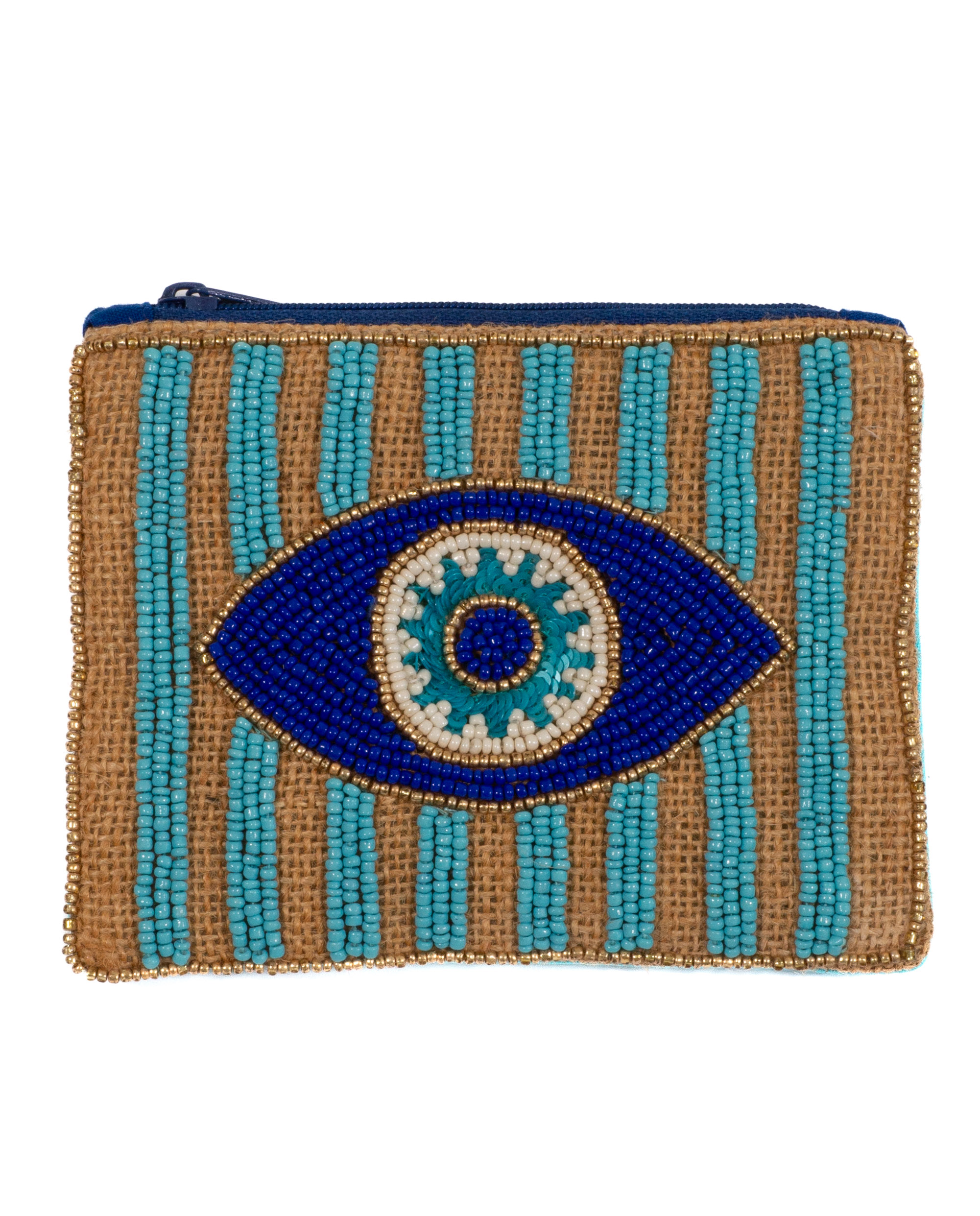 rechteckiger Jute-Beutel BLUE EYE in beige, HBT: 10/14/1 cm, mit hellblauen Perlenstreifen, VE: 4 Stück
