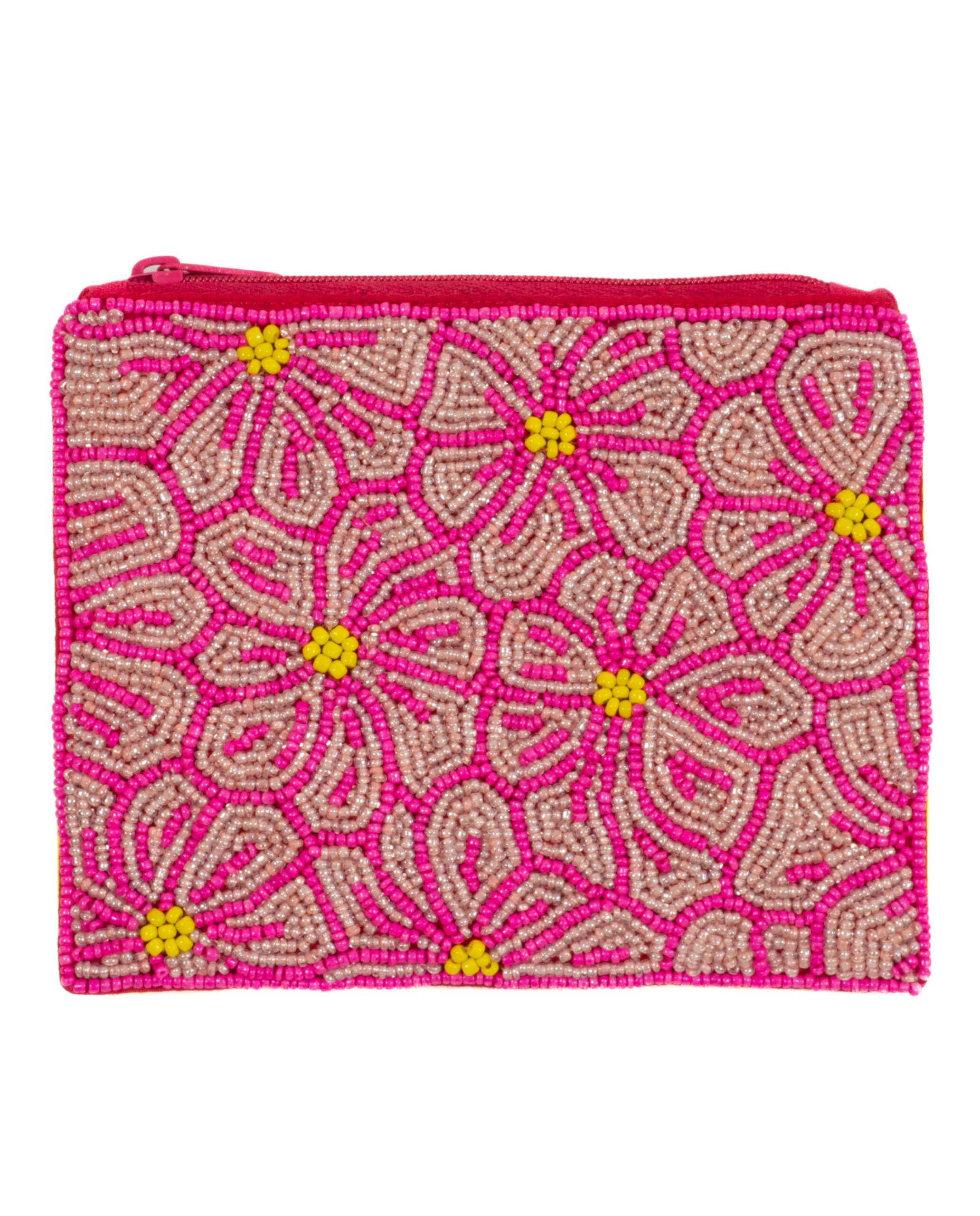 rechteckiger perlenbesetzter Beutel CLOCHETTE, HBT: 10/15/1 cm, gelbe Blüten auf pink, VE: 4 Stück