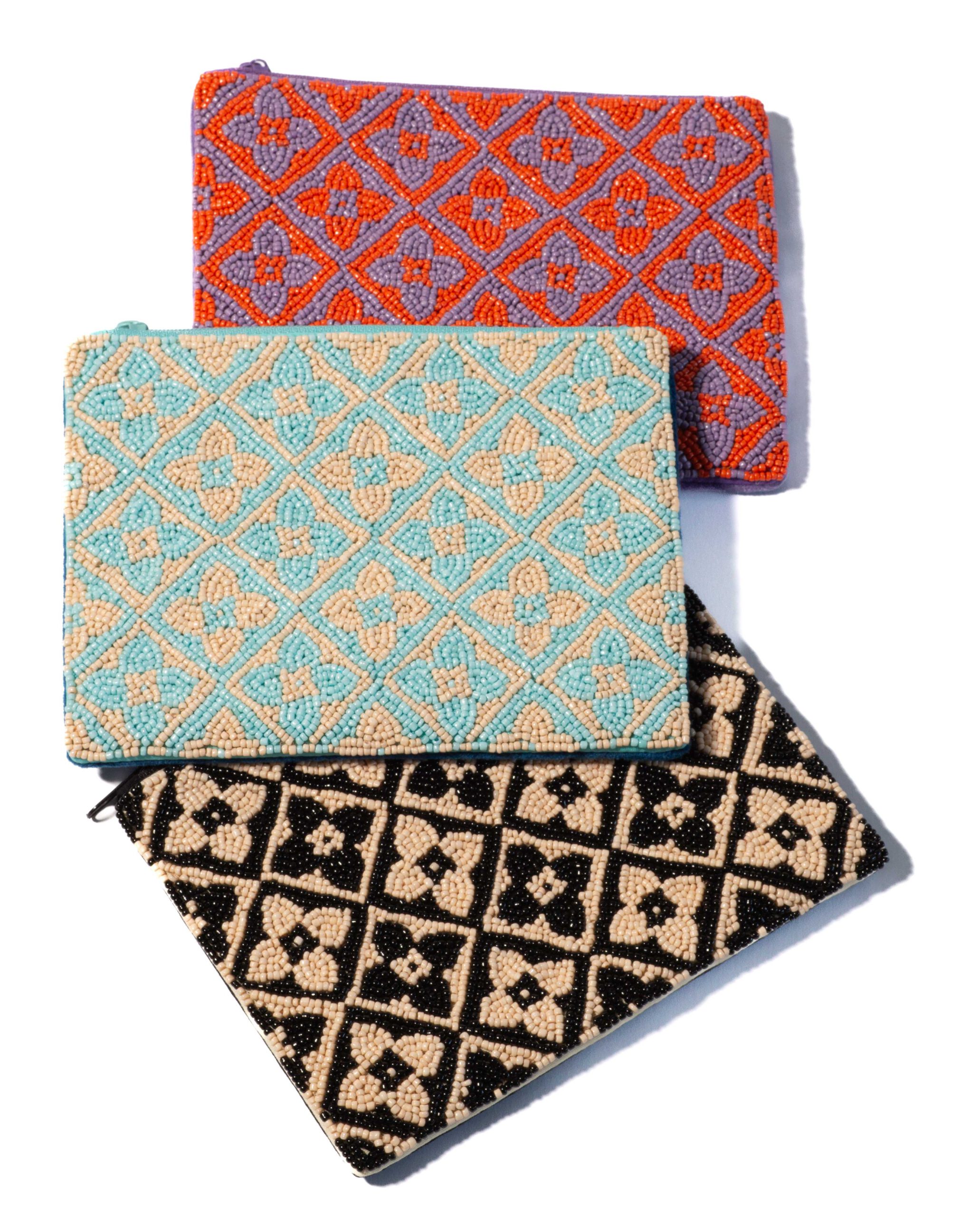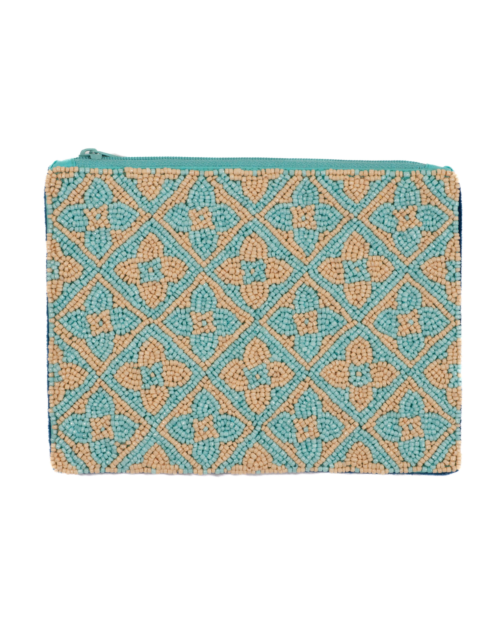 rechteckiger perlenbesetzter Beutel, HBT: 13/18/1 cm, beige + hellblaues Blüten-Ornament, VE: 4 Stück
