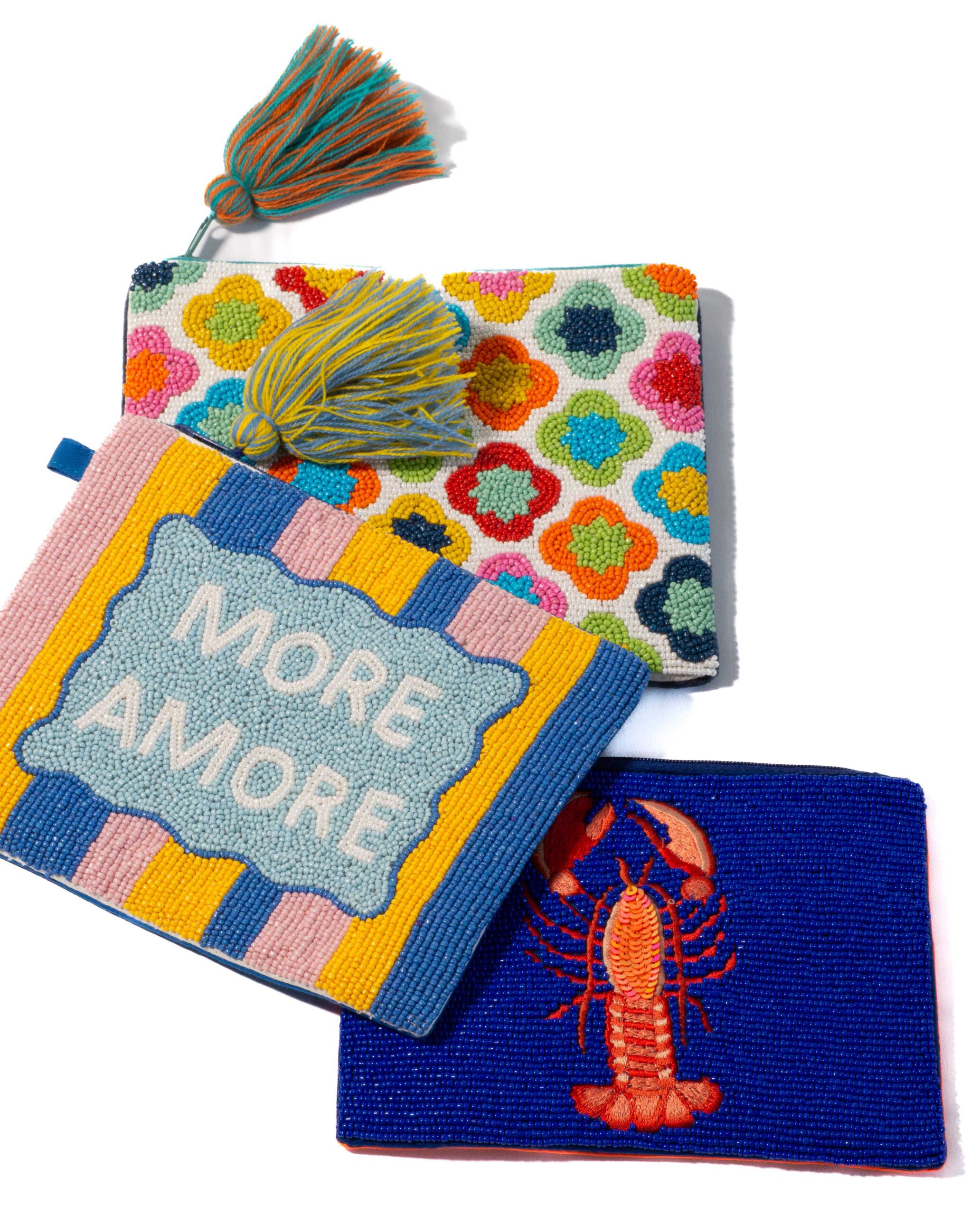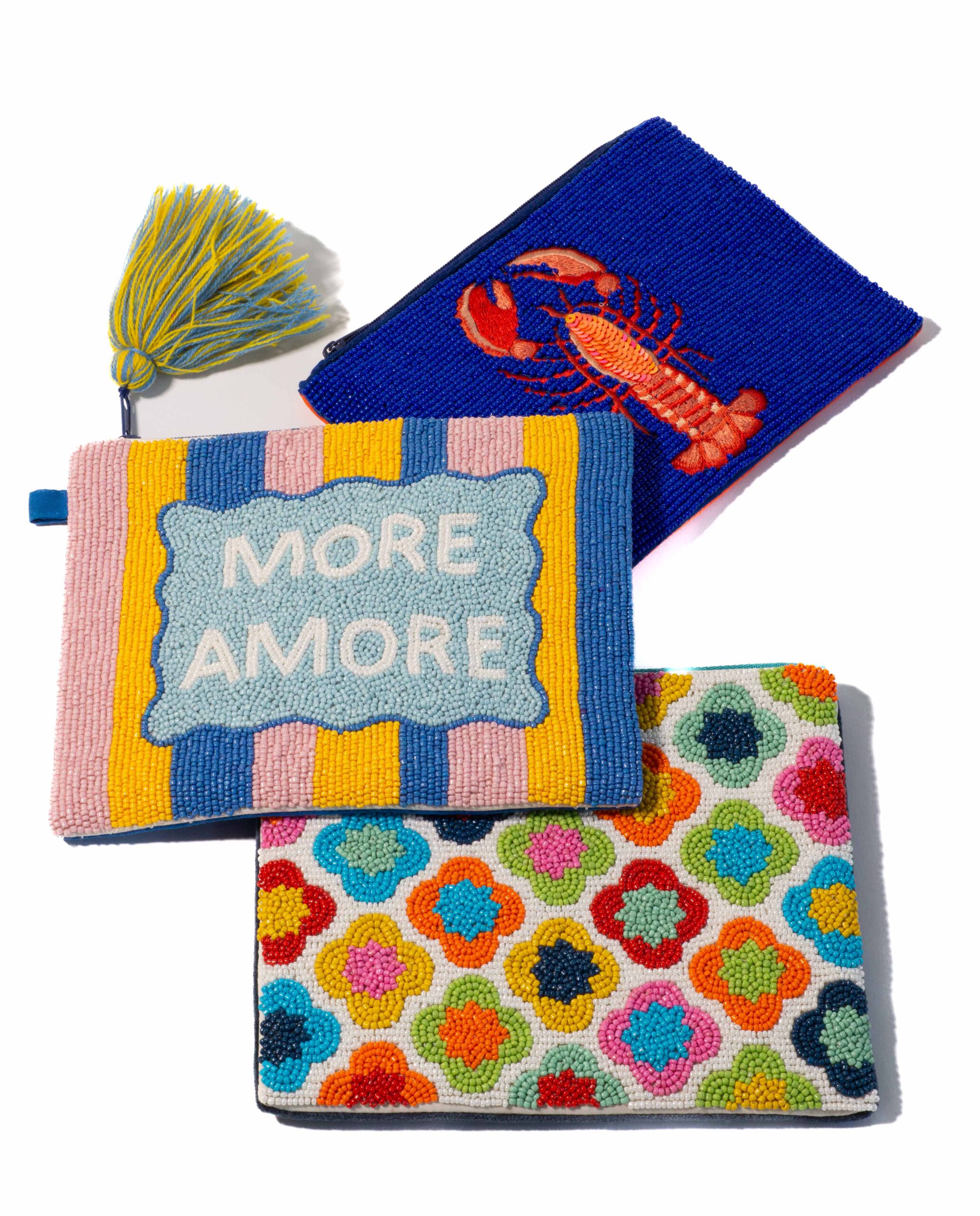 rechteckiger perlenbesetzter Beutel MORE AMORE, HBT: 16/20/1 cm, blau, gelb + rose gestreift, VE: 4 Stück