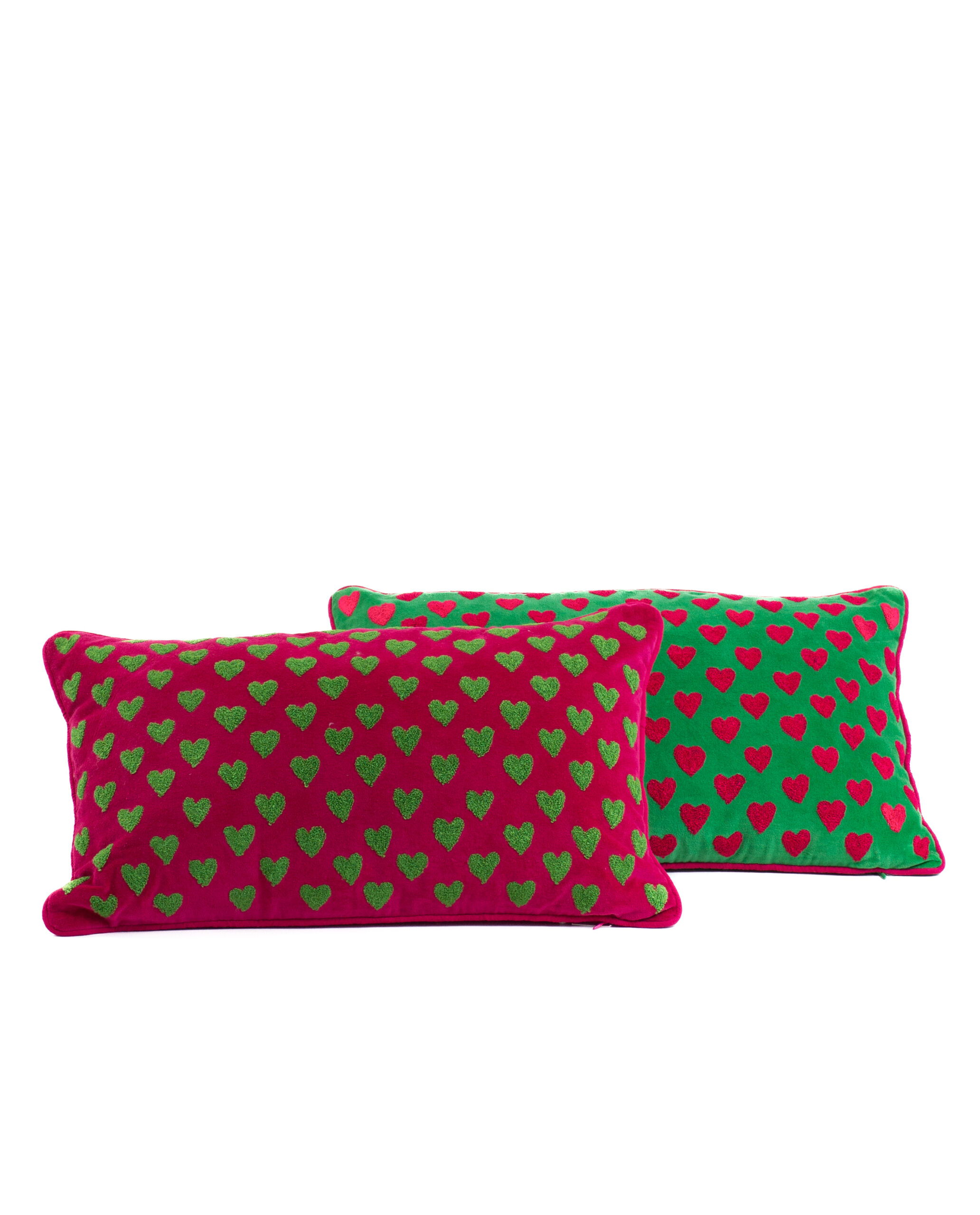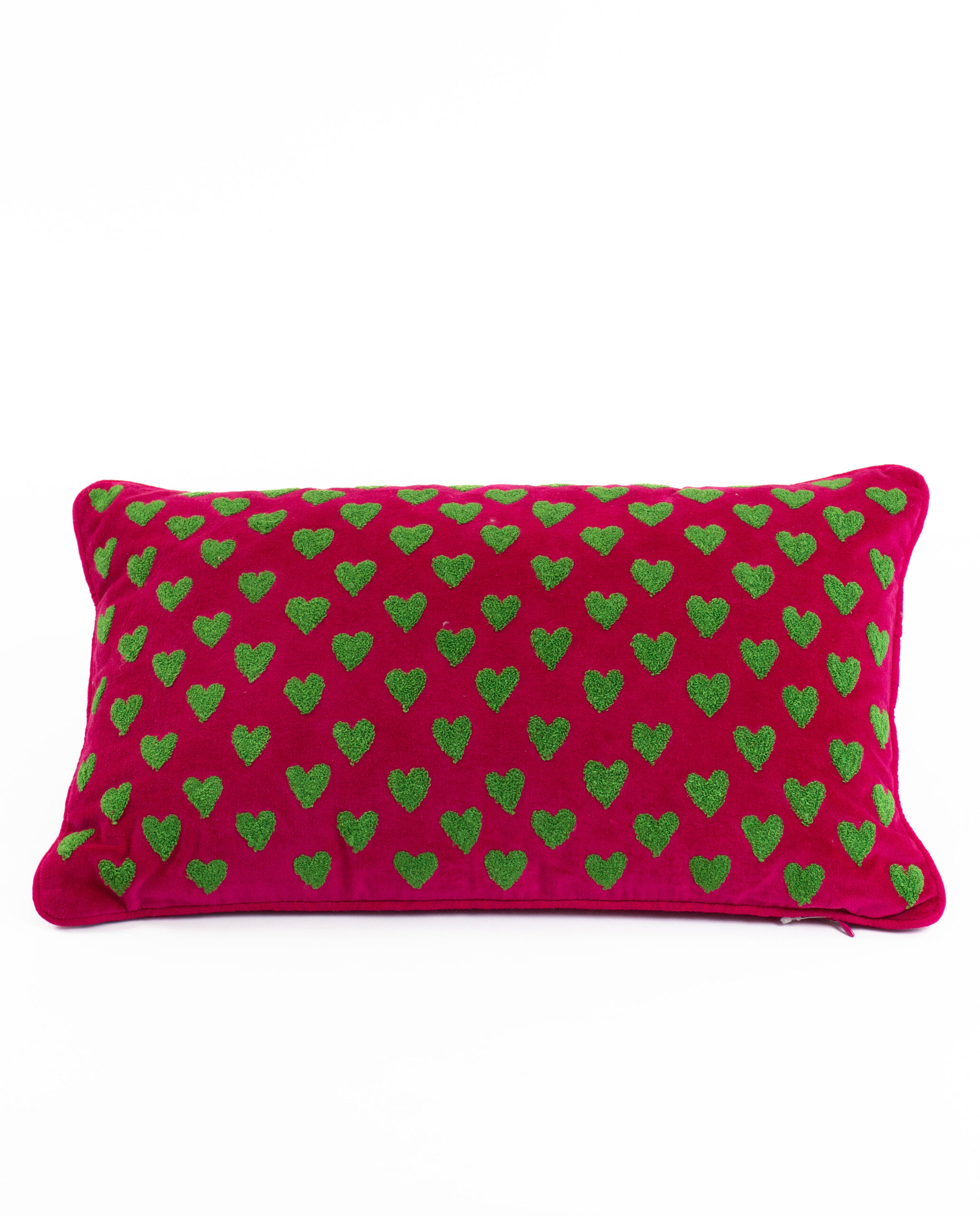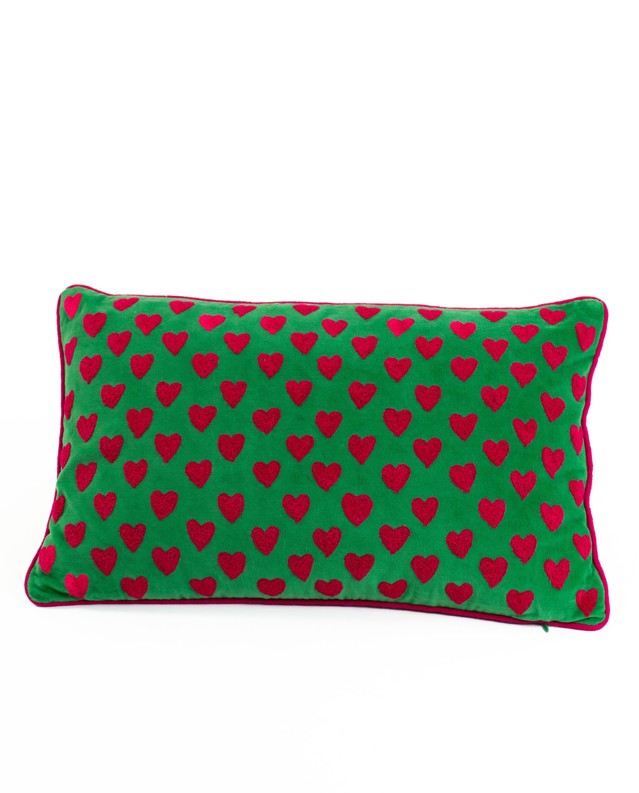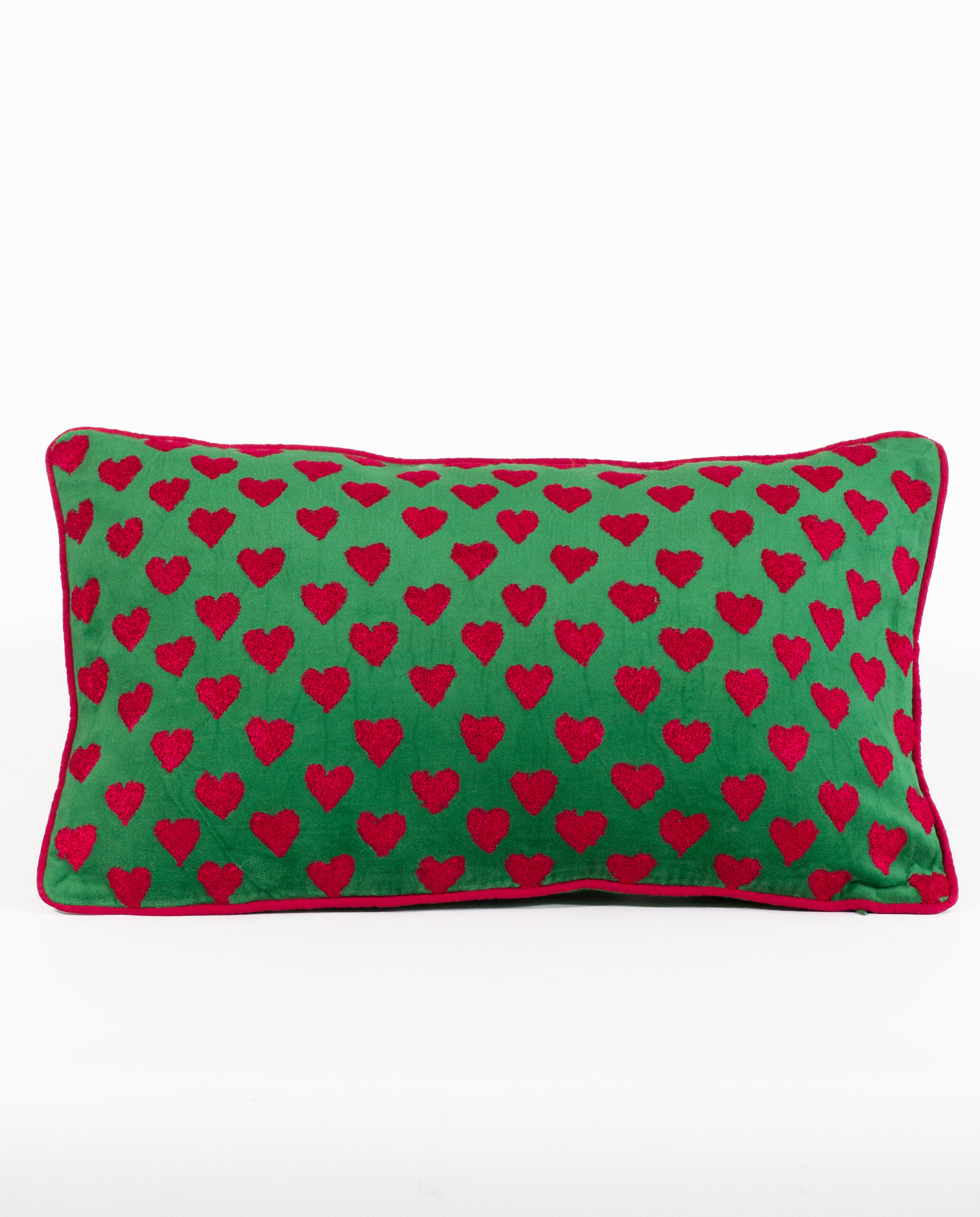 rechteckiges Samt-Kissen HEARTS in rot mit grünen Herzen, HBT: 10/30/50 cm, inkl. Inlett, VE: 1 Stück