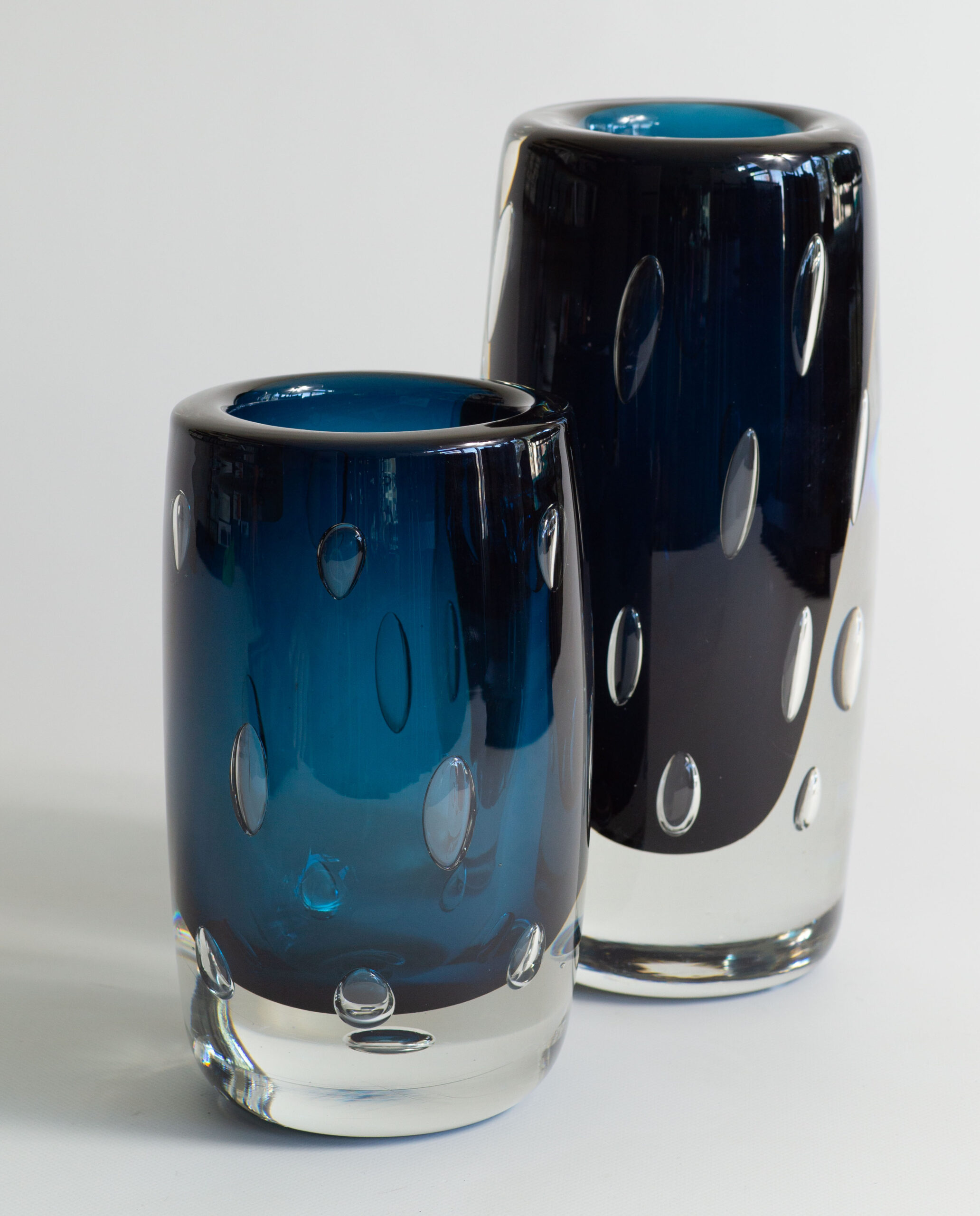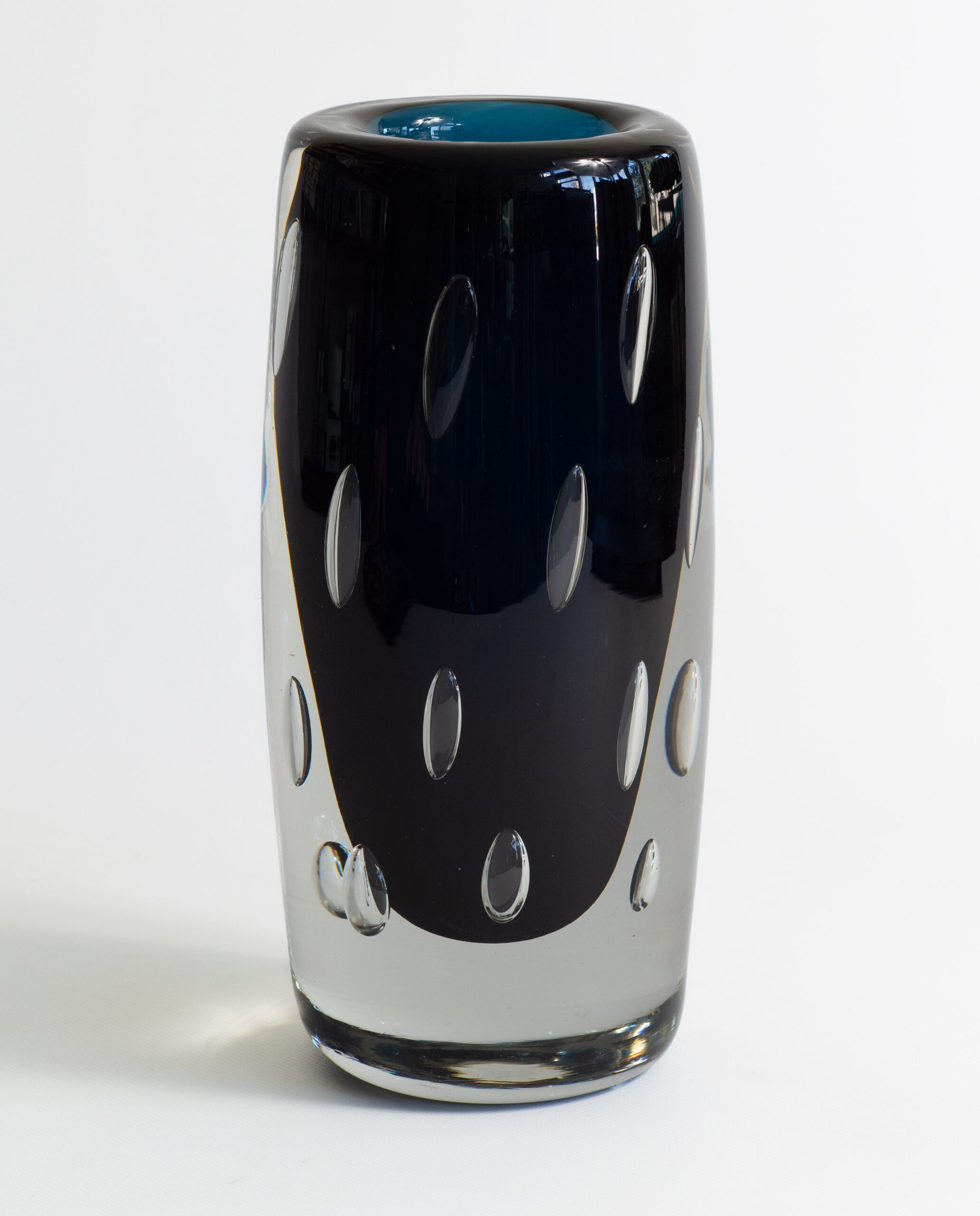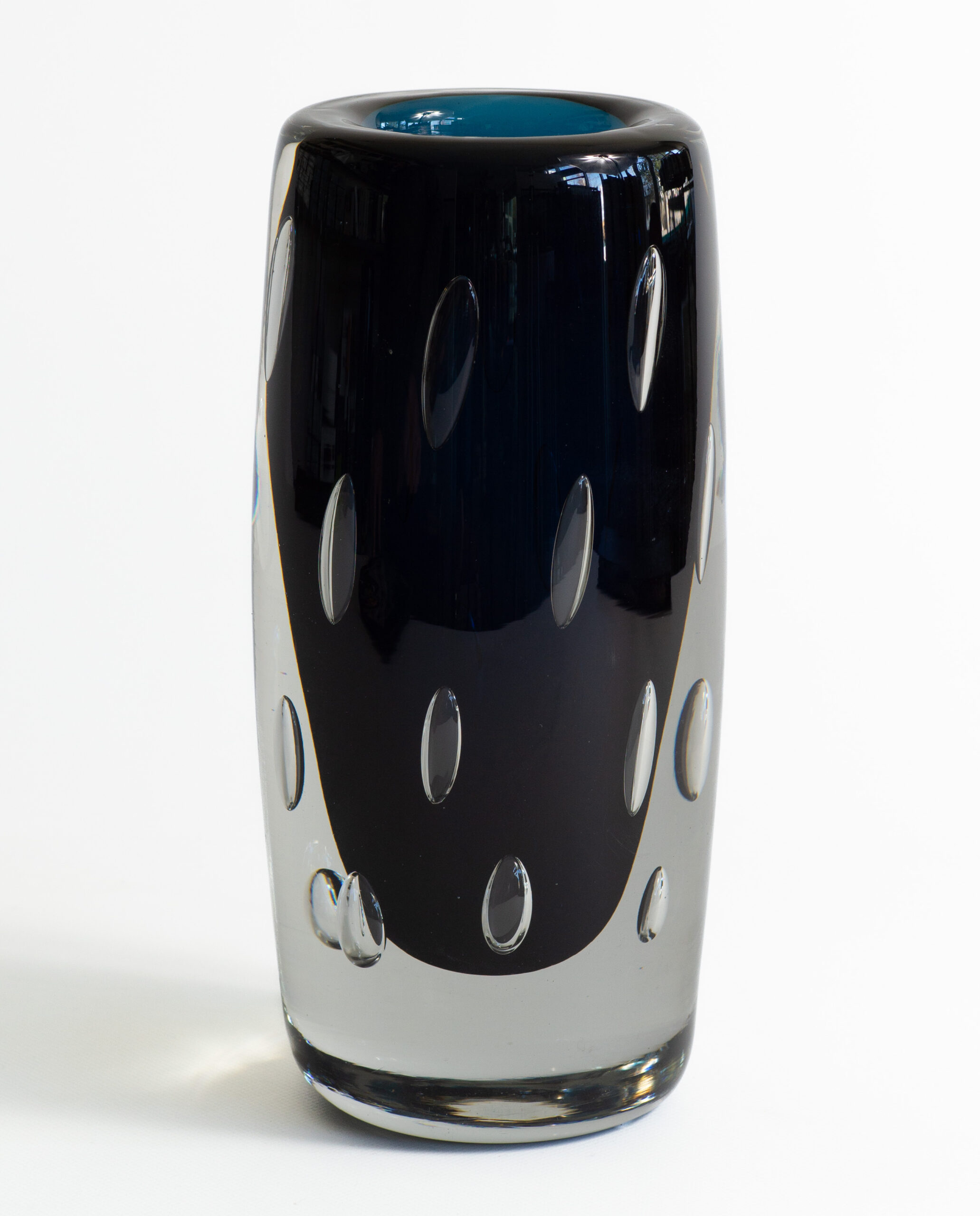 runde dickwandige Glas-Vase in dunkelblau, H: 28 ø: 13 cm, klare Punkte und klarer Boden, VE: 1 Stück