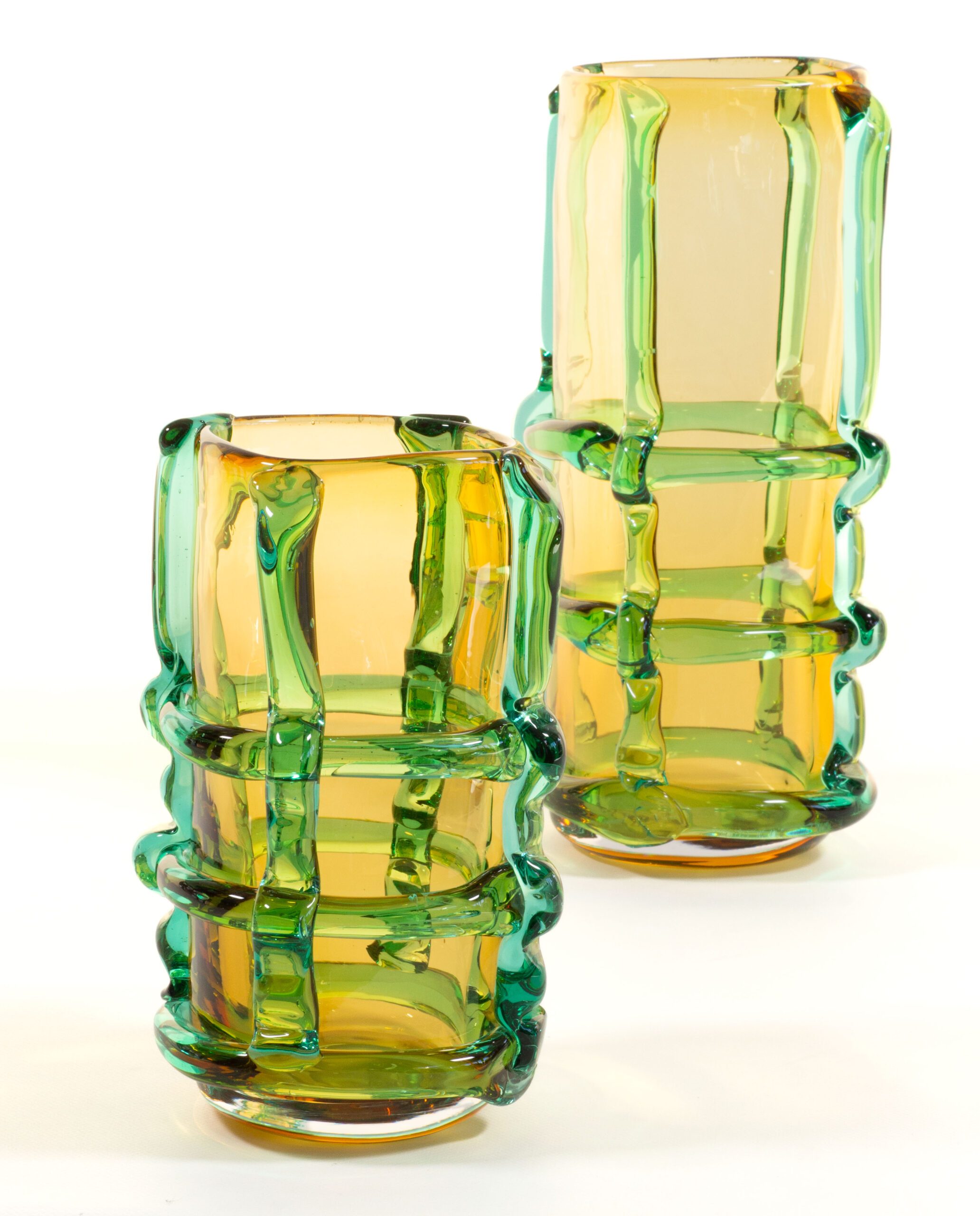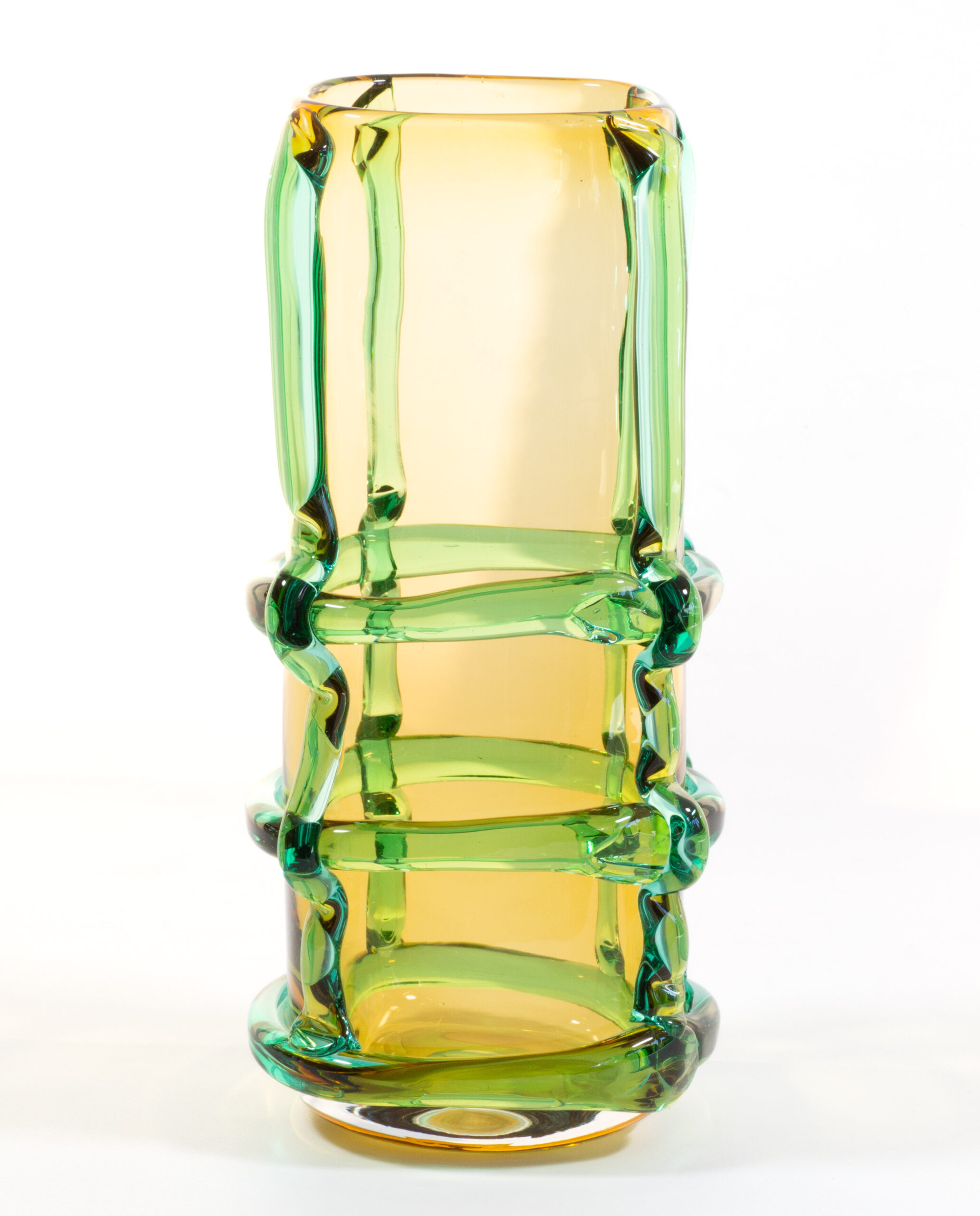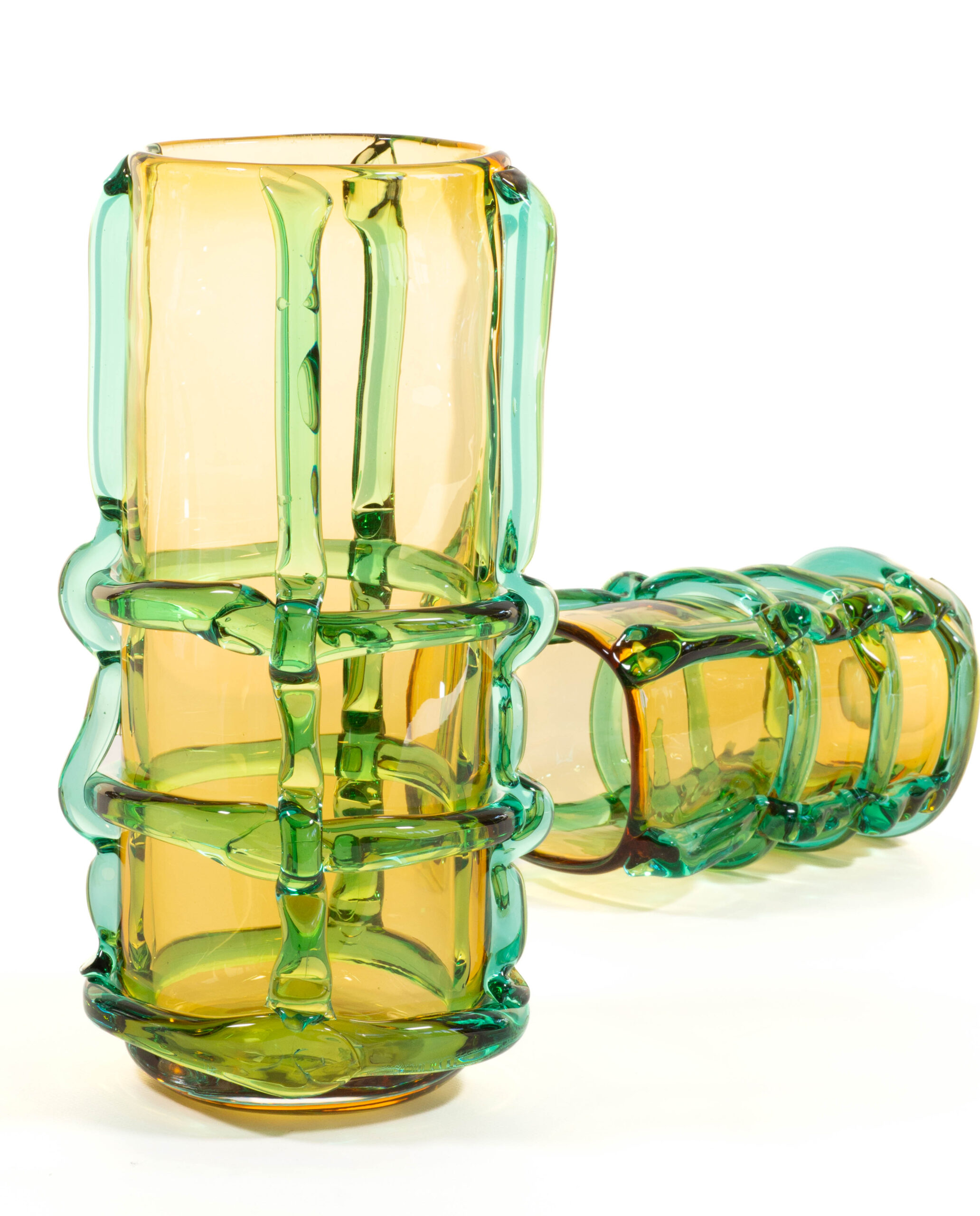 Glas-Vase FRANJA in amber, HBT: 31/15/15 cm, mit Applikationen in grün, VE: 1 Stück